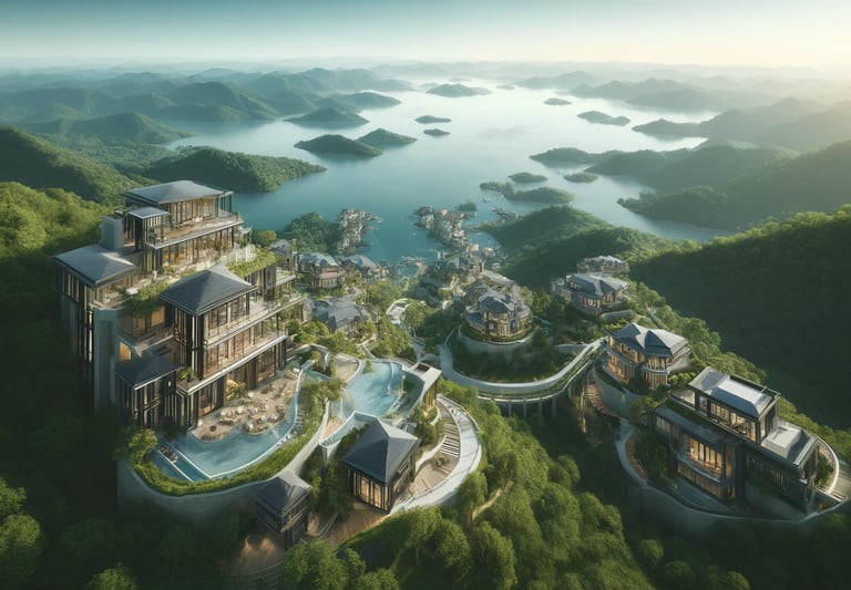 To the right of Hollywood (facing the lake) lies the Beverly Hills View Plaza, featuring: • Upscale shopping • Fine dining and rooftop bars • Open-air lounges with panoramic lake and island views.