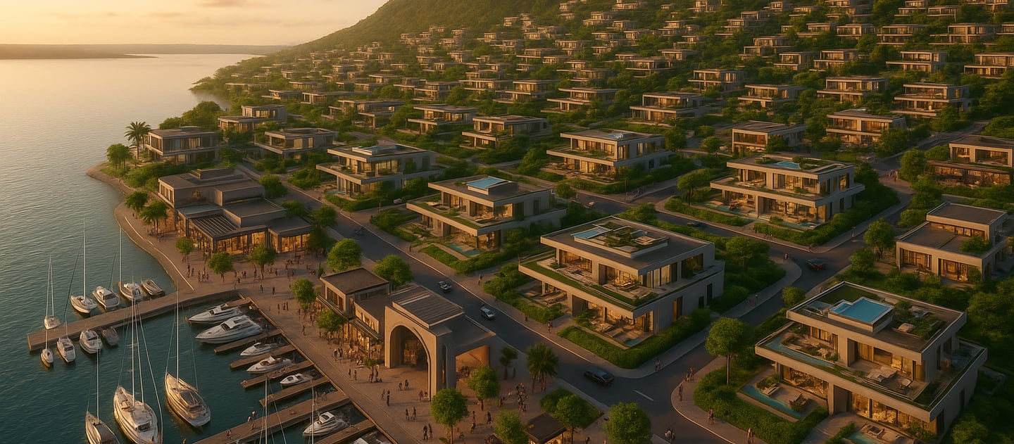 • Sunset Marina – Lakefront Dock & Water Sports Hub A stunning pier at the lakefront designed for boats, yachts, jet skis, kayaking, fishing, and water sports adventures. The marina brings both lifestyle and tourism income to the heart of Harmony Bay.